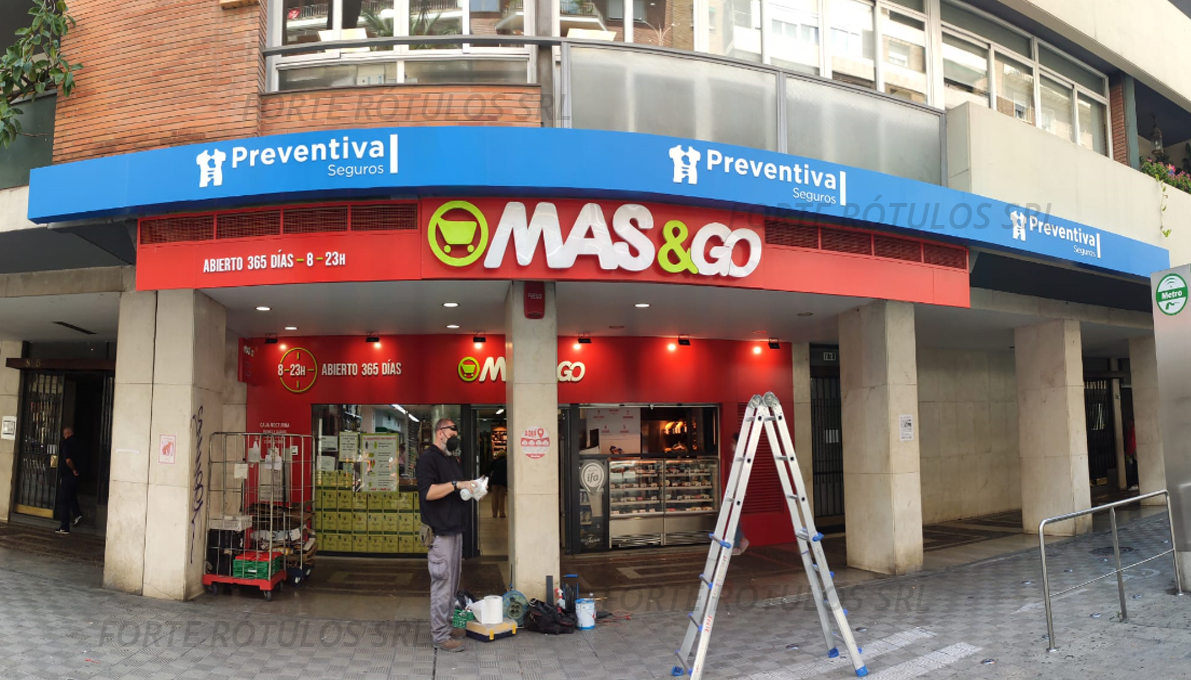 Rótulo luminoso con corpóreo de Plexiglás para Preventiva. El rótulo inferior de Mas&Go también fue fabricado e instalado por nuestra Sociedad.